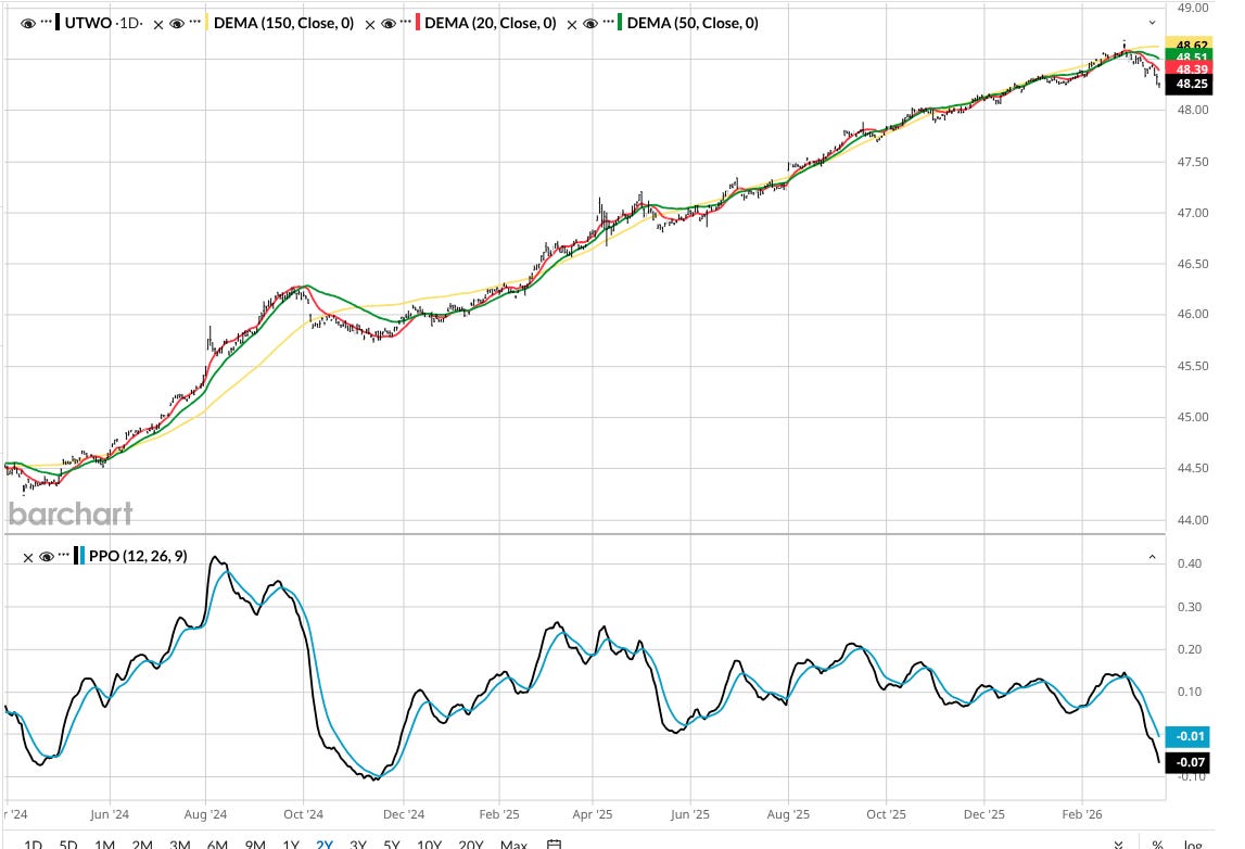 The other one is US Treasury 2 Year Note ETF (UTWO). I present this one in large part because I’m closely monitoring 2-year Treasury rates. Not so much to own this ETF, but because I’m starting to see a real possibility that for those who do not use inverse or volatility ETFs or put options in their portfolio, this might end up being a top performer over the next 24 months. I’ve seen it many times before.
