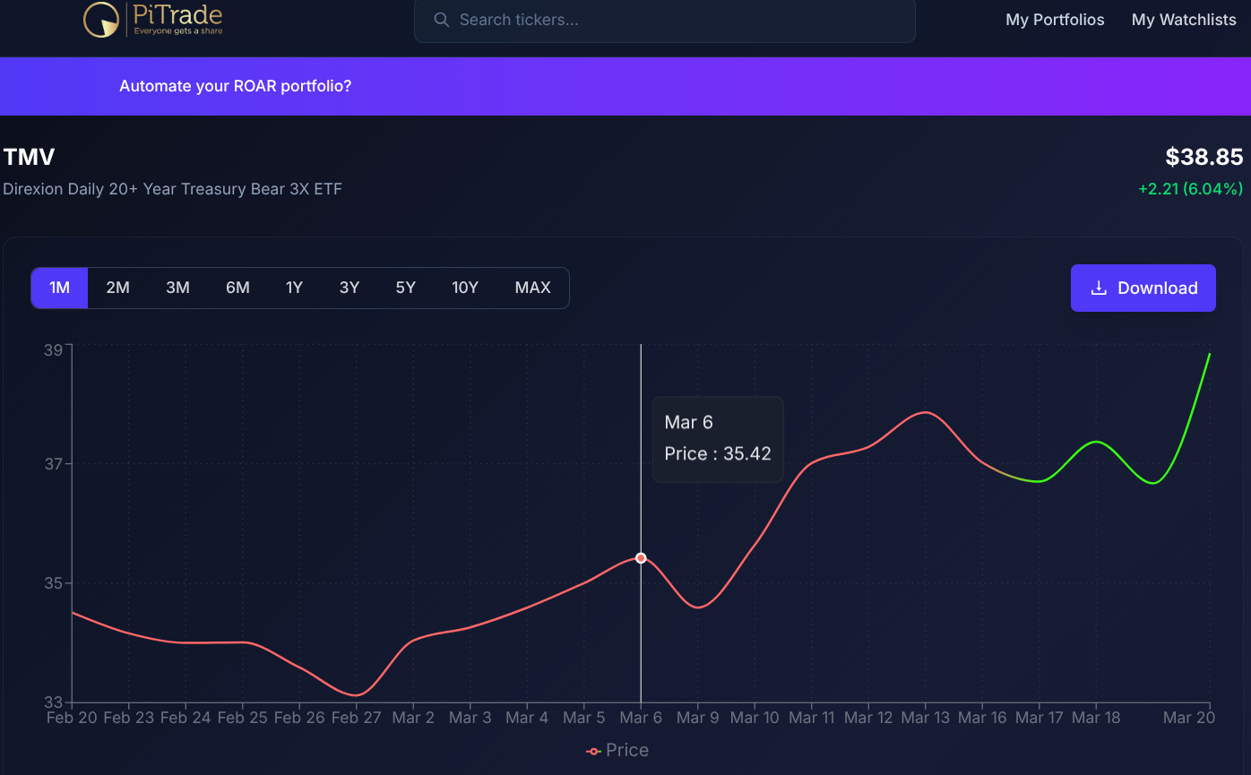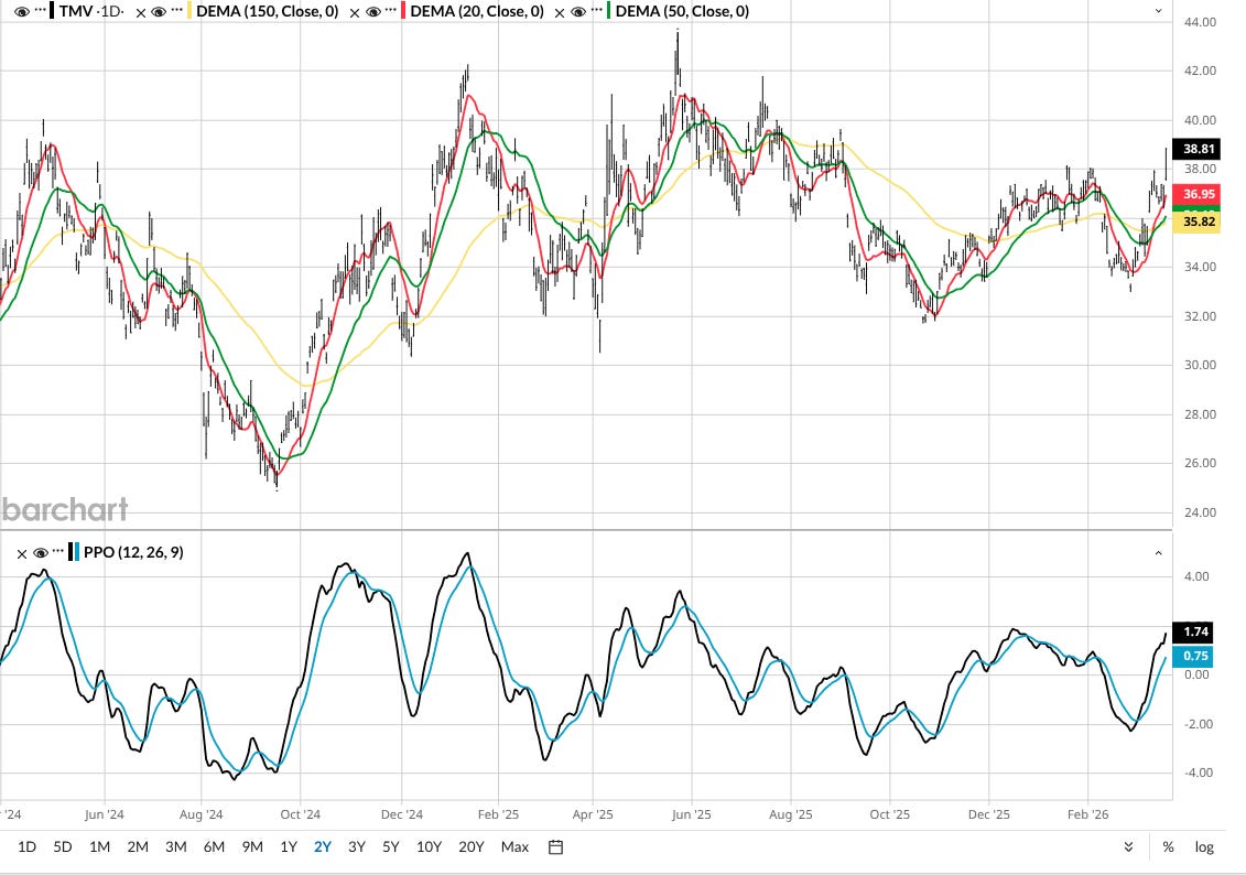 TMV is not for everyone for sure. It is 3x leveraged. So if rates continue to rise it will continue to spike higher. Of course, the reverse is true as well. A sudden flight to quality rally in bonds will sink this fast. That’s why to me, these leveraged ETFs are very useful tools, but ONLY when used responsibly.