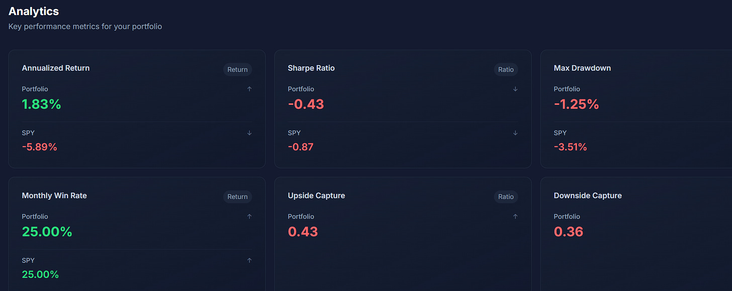 This portfolio whose past 3-month stats you see below, is one of many simple, risk-managed versions I have built. It only contains 3 ETFs, at all times.