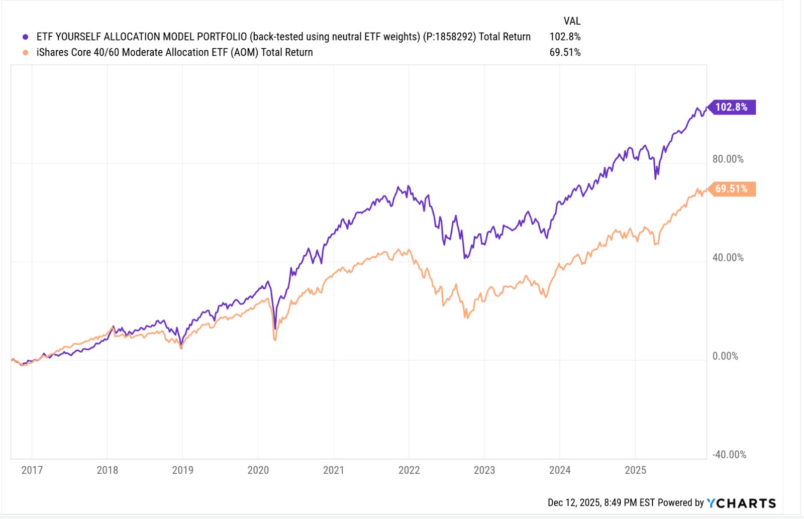 This model was created more recently, but we created a back-tested performance analysis based on the “neutral” allocation Rob uses to actively manage and allocate to most but not all of those 12 ETFs at any time.
