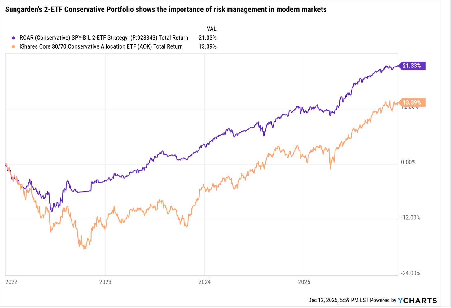 Sungarden Founder Rob Isbitts, leader of ETF Yourself, has run this 2-ETF portfolio, simply allocating to SPY (stocks) and BIL (cash) with his own money since the start of 2022. He shares it with his paying subscribers every Tuesday in The Weekly ROAR. It is based on the ROAR* Score he created to consolidate his 40 years of charting stocks and funds.