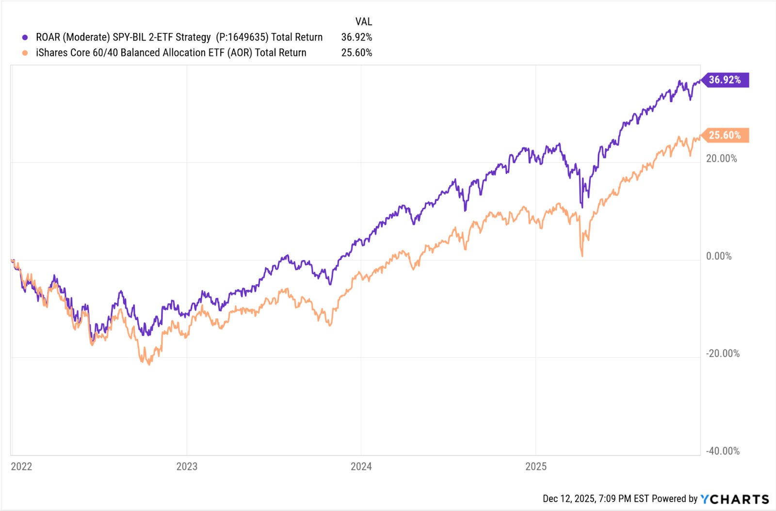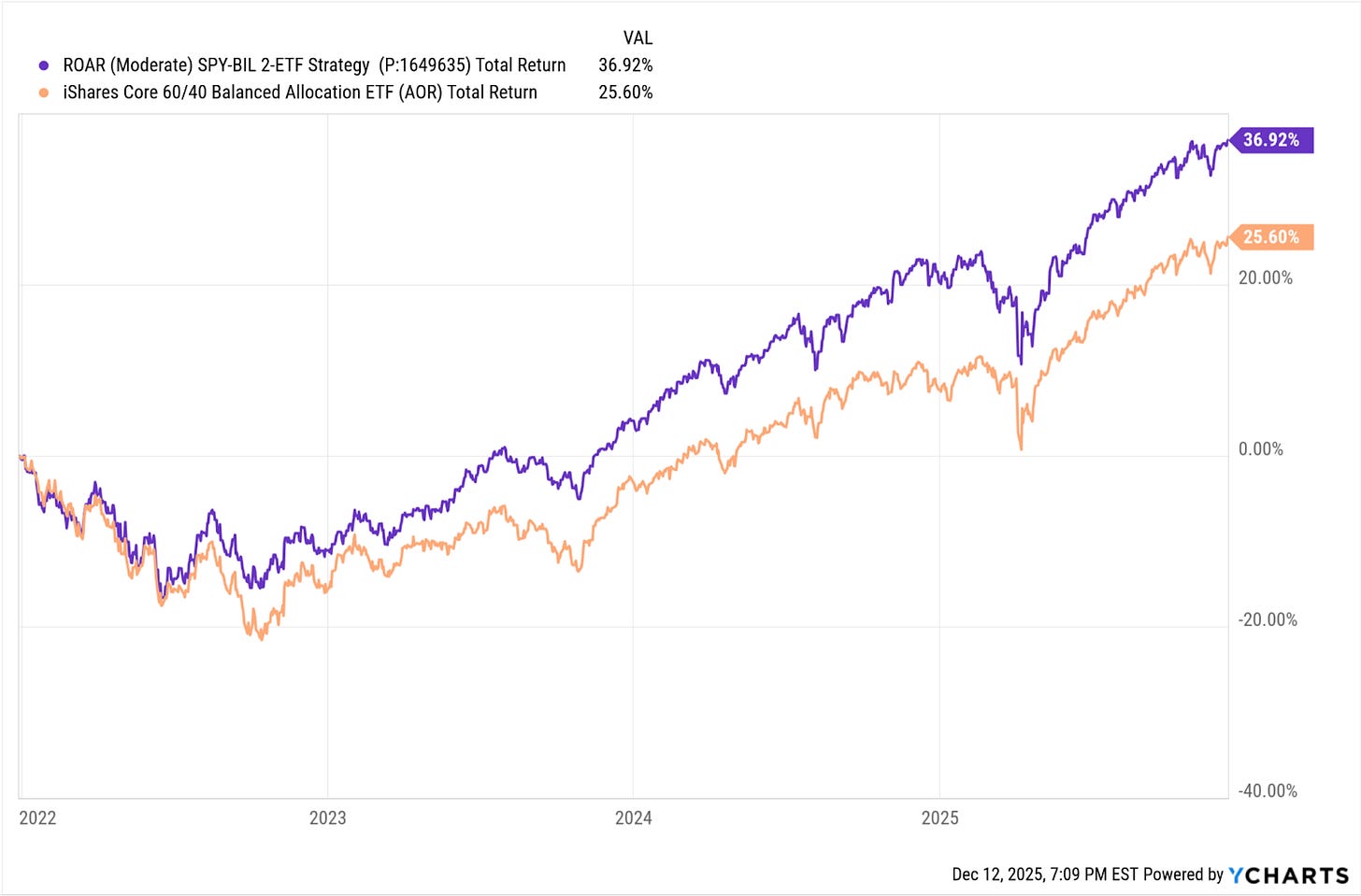 And, here’s a second, more moderate-risk version of that 2-ETF concept. In this portfolio, Rob allocates 50% to the SPY ETF and allocates the other 50% using the ROAR Score approach.