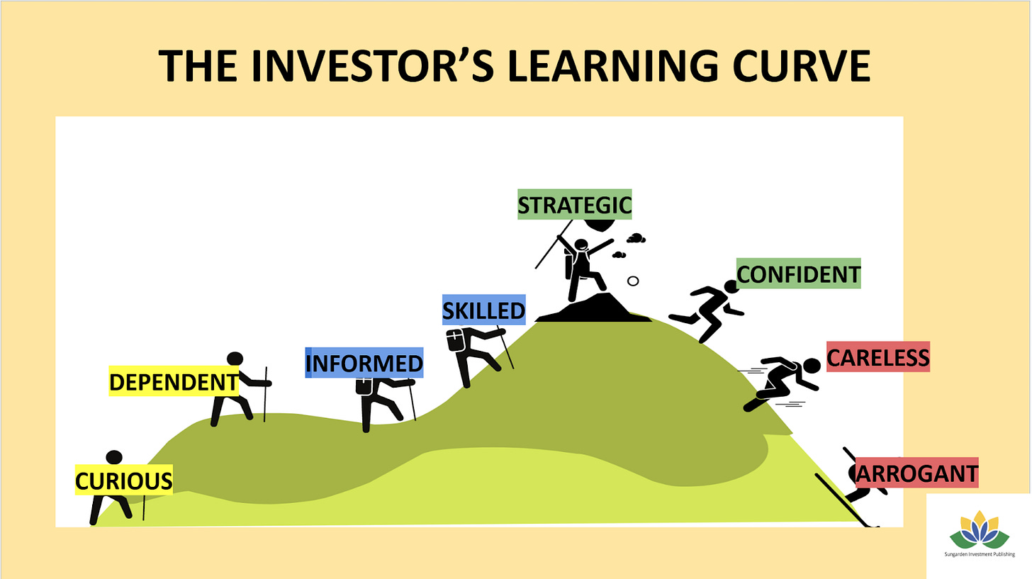 But as the expression goes, that feeds you for a day. If you want to learn how to fish (for a well-structured, defensive-minded investment portfolio), you need to move up this INVESTOR’S LEARNING CURVE...without falling off the mountain (red zones on right).