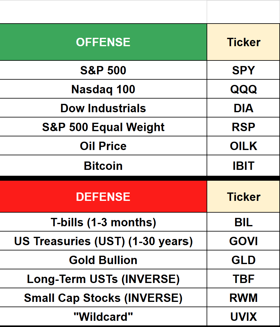 We believe in “playing offense and defense at the same time.” We provide you with portfolio models ranging from 2-ETF models like the one shown above, to our Allocation model that selects from and rotates among the 12 “macro market” ETFs shown here.