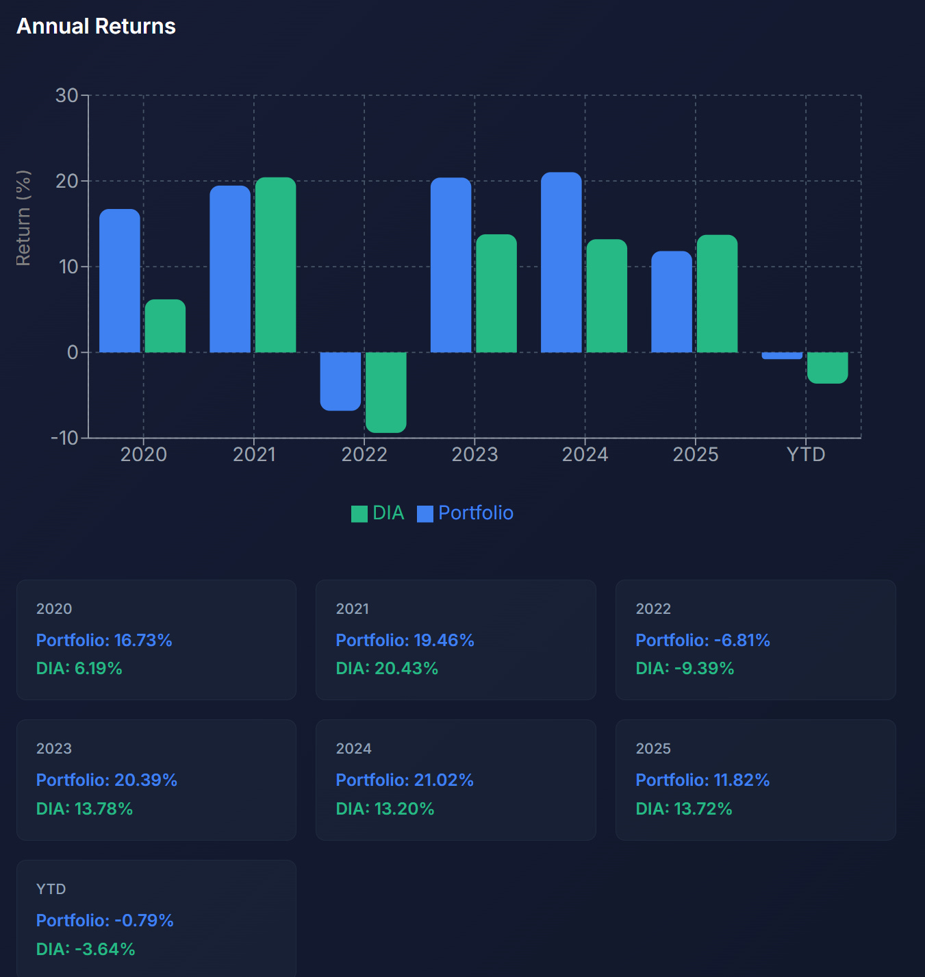 In each calendar year since 2020, Dow 30 has either outperformed DIA, or has earned a return of at least 11.8%.