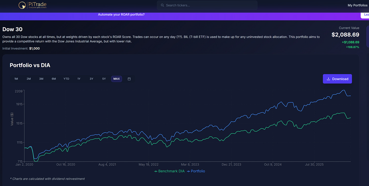 It owns those stocks in varying allocations, based on the individual and combined ROAR Score of the Dow 30 stocks at any point in time.