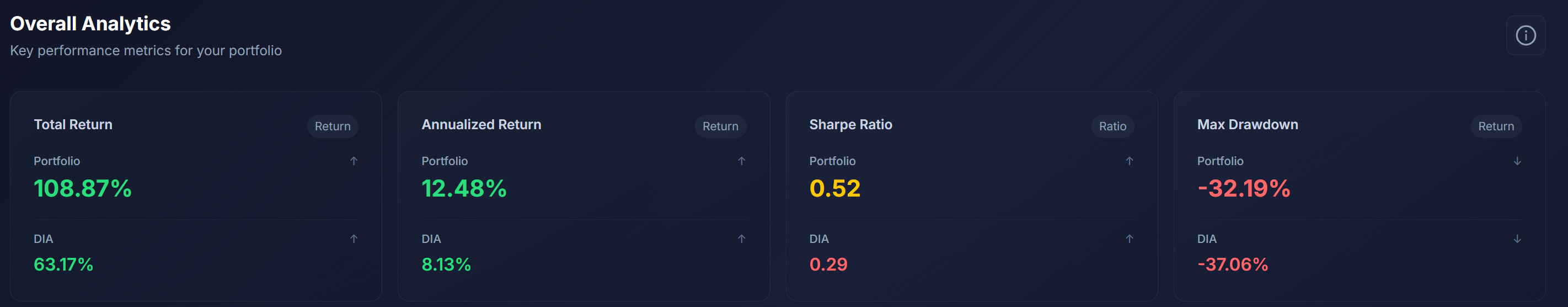 Cash is its only hedge (no inverse ETFs), and it is benchmarked to the DIA ETF.