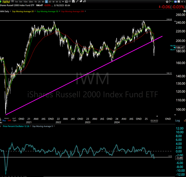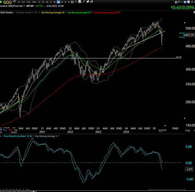 I'd like to introduce my new bestie, the 20-week Exponential Moving Average (I need to find friends with shorter names). Here's QQQ and that cute yellow line is pointing down for the first time since early 2022. Before that, it had not looked like this since February, 2020. And before that, October of 2018. If there were such a thing as "implicated in the murder of the stock market," this would be the perp. Every one of those dates lines up with a market decline of 20%+. But we just had one of those. Summary: can't call any type of "bottom." I can only say that risk is still dangerously high. Some try to buy into that, some don't. Just understand what you're dealing with.
