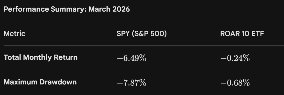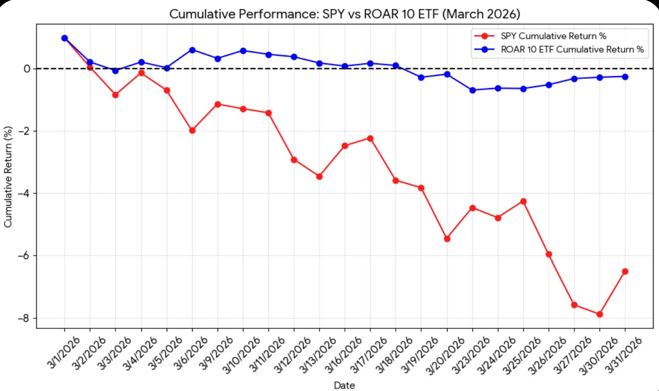 Mitigating the “Deepest Cuts”: While SPY investors watched their cumulative monthly return sink to a low of 7.8% by March 30th, the ROAR 10 ETF never saw its cumulative performance dip below 0.7%. This limited “bend” prevented the emotional panic that often leads investors to sell at the bottom.