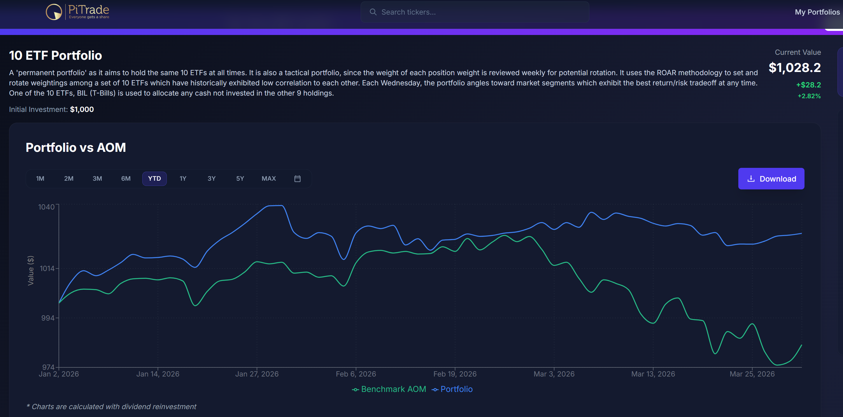 Here, right from the ROAR.PiTrade.com site, is the first quarter. ROAR 10 ETF in blue, and its “best-fit” benchmark, ETF ticker AOM, which is 40% stocks/60% bonds. Again, SPY was down 7% through yesterday. QQQ was off closer to 10%. The AGG bond index ETF was off slightly.