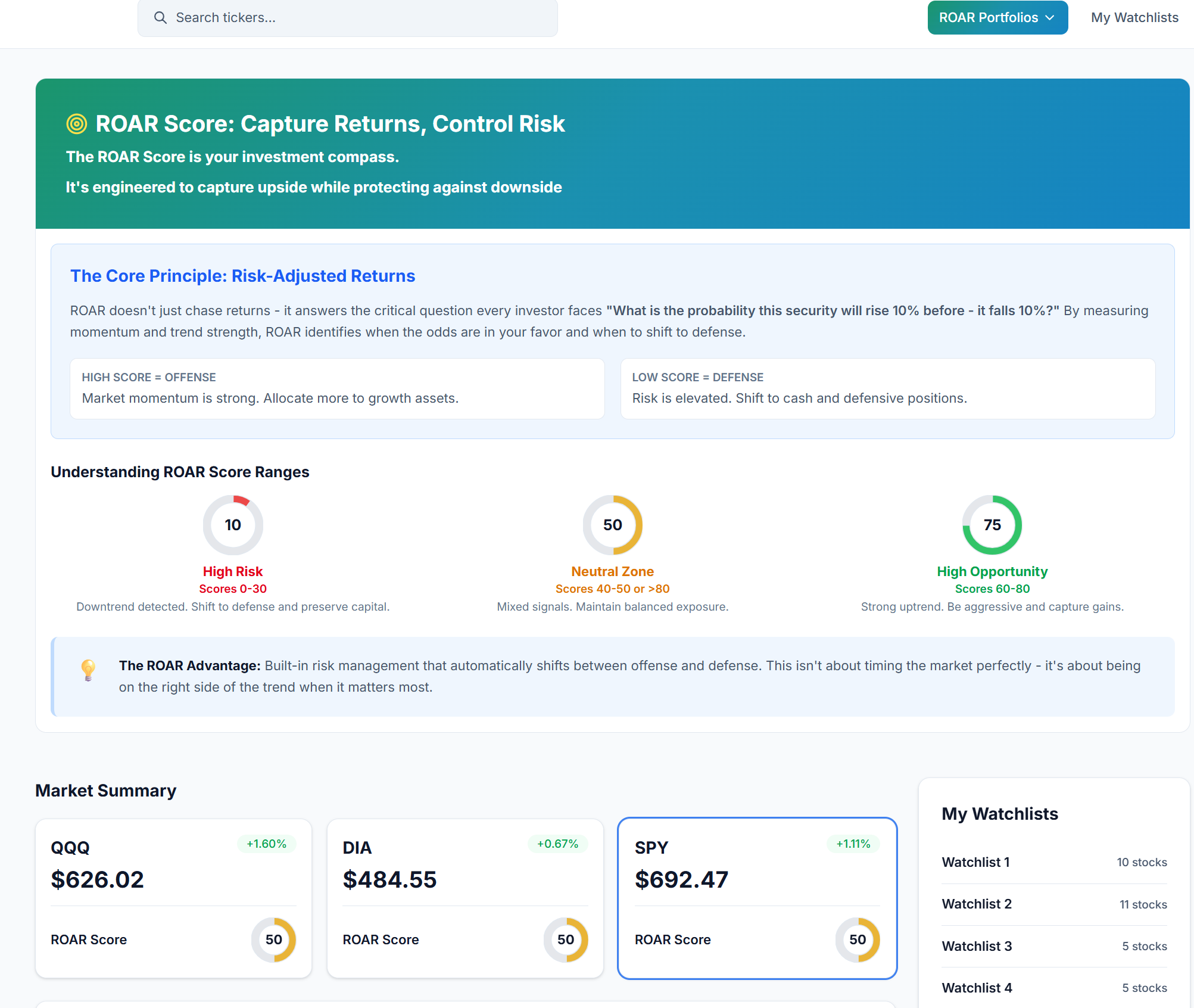 Note that ROAR Scores for SPY, QQQ and DIA have all increased to 50. They were 20 not long ago. That’s like falling behind by 4 runs early, and tying the game in the middle innings. But to win the game, you need to get the lead, and hold it.